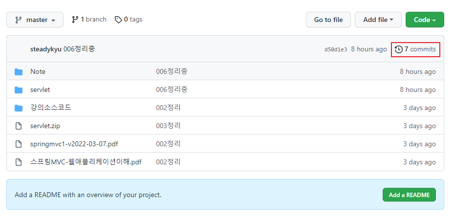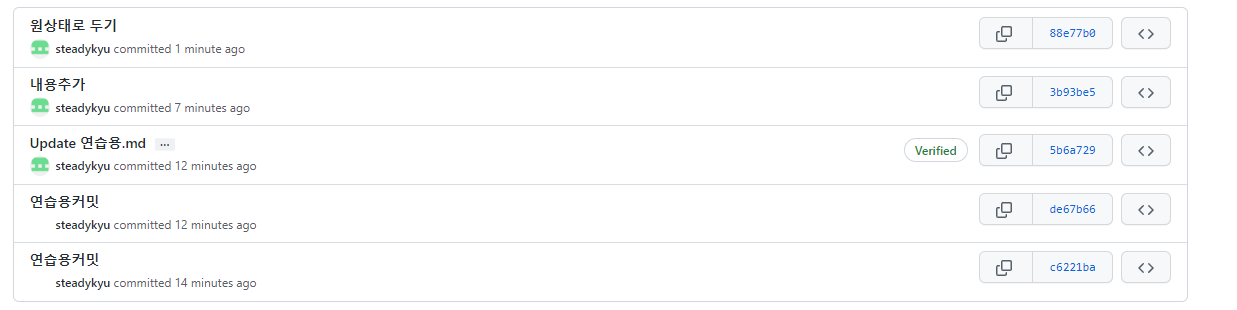 레포지토리의 표시한 부분을 누르면, 커밋한 내용들을 볼수 있다.