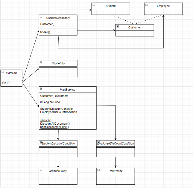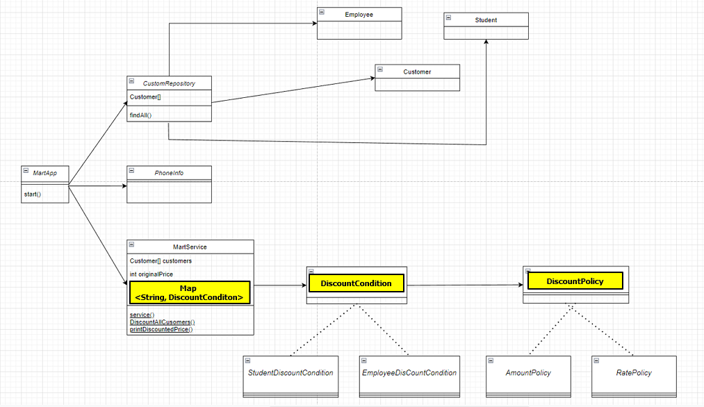 MartService 클래스는 인터페이스를 구현하는 구현체, 즉 할인조건들을 모두 가져와야합니다. 또한 고객의 유형에 따라 할인정도를 다르게 합니다.